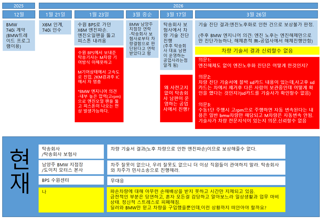 그 과정에서 기존 X6M 차량이 BMW중고차인증센터(BPS라고 지칭)로 이동하는 과정중 탁송기사의 M차량 운전미숙으로 인한 사고가 발생되었고, 1월 23일에 발생한 사건이 아직도 해결조차 되지 못하고 있습니다.