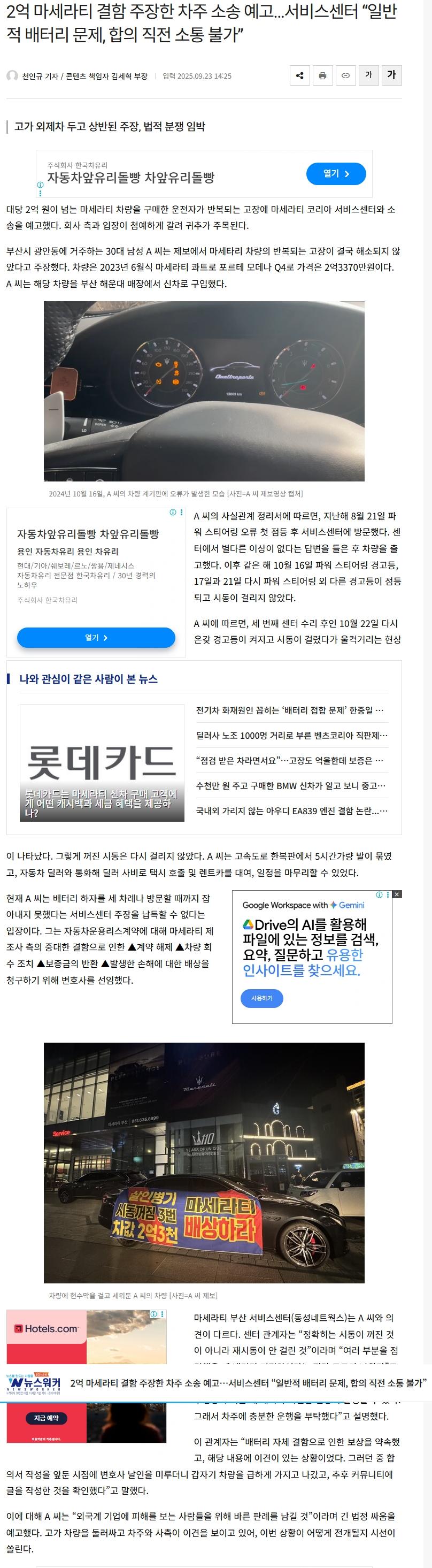 2억 마세라티 결함 주장한 차주 소송 예고…서비스센터 “일반적 배터리 문제, 합의 직전 소통 불가” (23) 이미지 26.04.08 07:56 추천 65 조회 13771 귀공자JAY 작성글보기 신고 댓글 www.newsworker.co.kr.jpeg" /> 추천 65 본 게시물을 뉴스 및 기타 매체에서 인용하실 때는 '보배드림' 출처 표기를 부탁드립니다 페북 트윗 밴드 카톡 카스 복사 스크랩 삭제 수정 신고 불법광고신고 목록