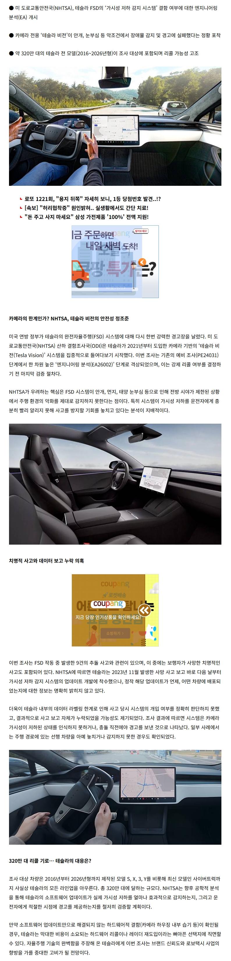 “사고 보고 숨겼나” 美 당국, 테슬라 FSD 결함 은폐 의혹 정밀 검증 이미지 04:27 추천 0 조회 63 귀공자JAY 작성글보기 신고 댓글 추천 0 본 게시물을 뉴스 및 기타 매체에서 인용하실 때는 '보배드림' 출처 표기를 부탁드립니다 페북 트윗 밴드 카톡 카스 복사 스크랩 삭제 수정 신고 불법광고신고 목록
