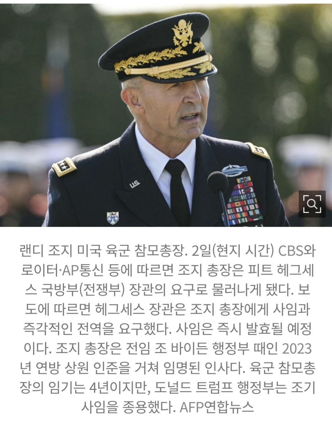 헤그세스가 장관으로 임명되고 난뒤 4성급 이상의 미군장성들을 계속 조기 해임시키고 측근인물들로 서서히 갈아 치우고 있습니다