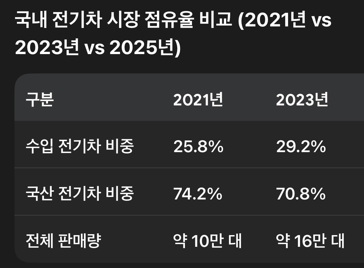 국내 전기차 시장에서 국산 비율 올해말 50% ? 이미지 휴대전화 26.04.03 16:42 추천 1 조회 267 수정 26.04.03 17:33 giazadongcha 작성글보기 신고 댓글 2026년 수입 전기차 비중 50% 예상 2040년 수입 전기차 비중 60% 예상 추천 1 본 게시물을 뉴스 및 기타 매체에서 인용하실 때는 '보배드림' 출처 표기를 부탁드립니다 페북 트윗 밴드 카톡 카스 복사 스크랩 삭제 수정 신고 불법광고신고 목록