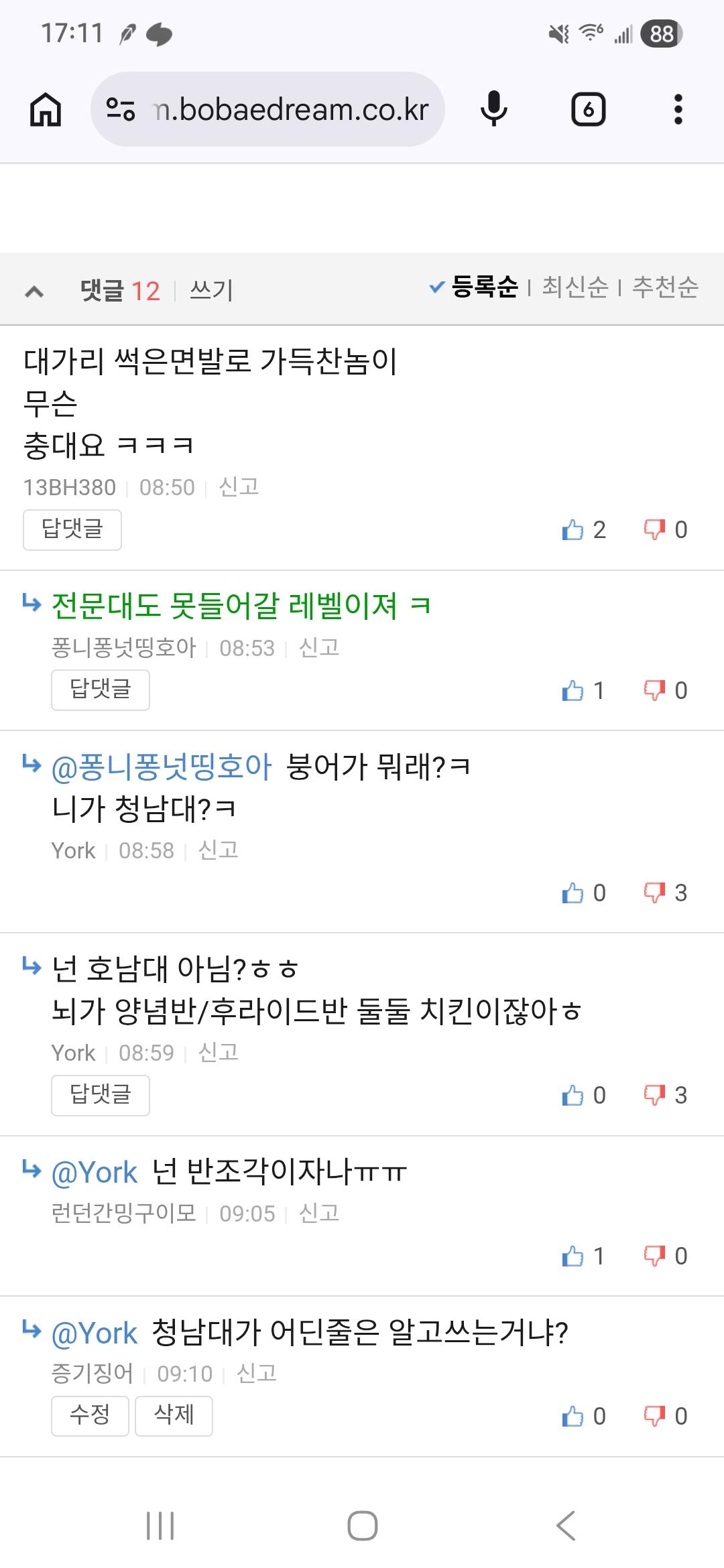 청남대가 뭔지도 몰랐지?jpg (4) 이미지 휴대전화 26.04.06 09:25 추천 3 조회 403 수정 26.04.06 09:26 증기징어 작성글보기 신고 댓글 덧글에 청남대가 언급됐는데 대학교인줄 알고 알아봤다가 금새 지운거보소 ㅋㅋㅋㅋㅋㅋㅋㅋㅋㅋㅋㅋㅋㅋㅋㅋㅋㅋㅋㅋㅋㅋ 대전, 충청권 주민이면 청남대는 다들 아는데 이걸 모른다? 얘는 대전에 산다는것도 구라라는것 ㅋㅋㅋㅋㅋㅋ 넌 숨쉬는것도 구라같어. 추천 3 본 게시물을 뉴스 및 기타 매체에서 인용하실 때는 '보배드림' 출처 표기를 부탁드립니다 페북 트윗 밴드 카톡 카스 복사 스크랩 삭제 수정 신고 불법광고신고 목록