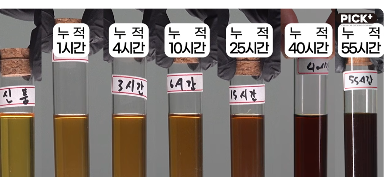 위 실험에서 본 오일상태를 보니 200시간정도에 맞춰 갈아주는게 맞는 것 같습니다.