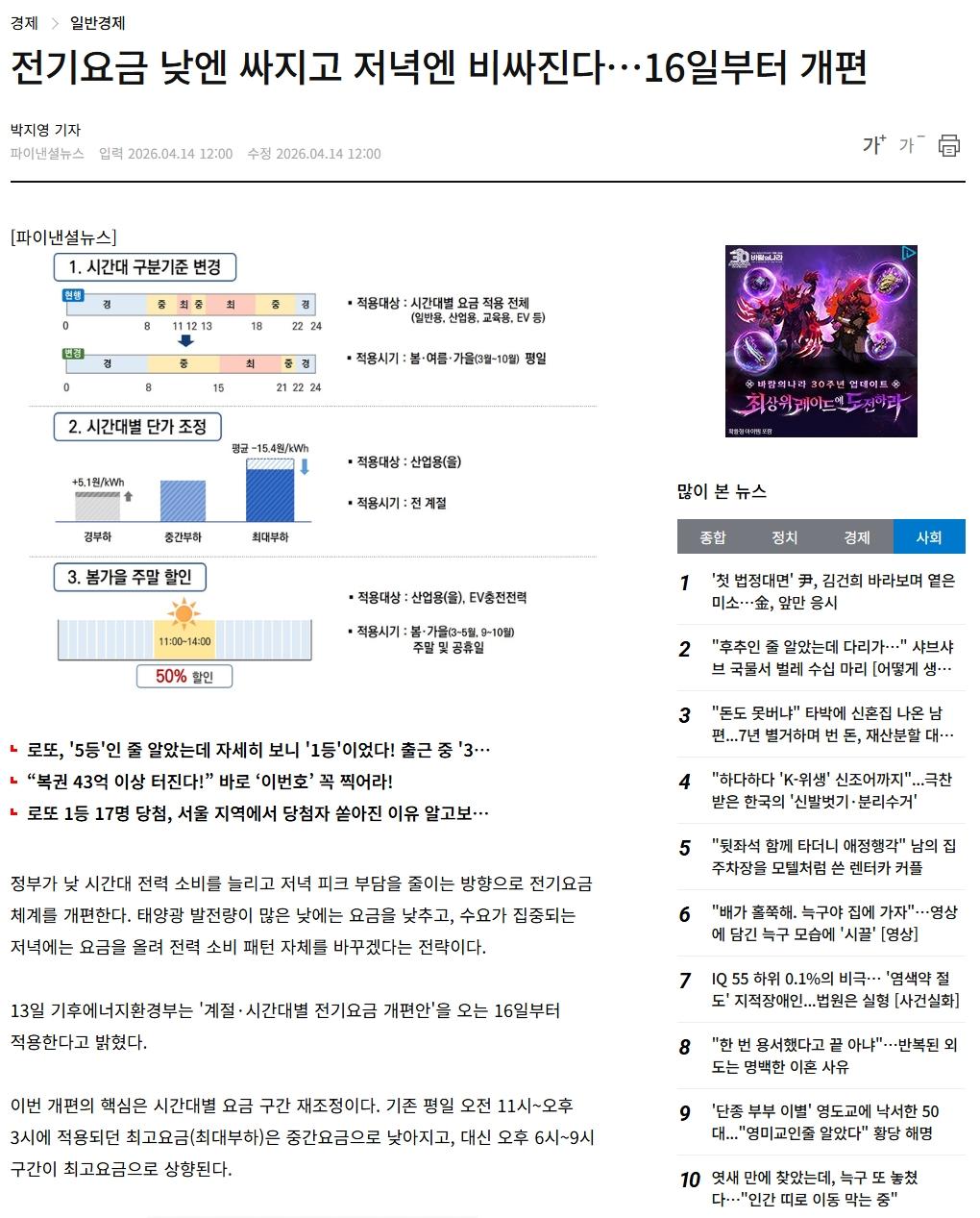 전기요금 개편 (13) 이미지 26.04.15 08:07 추천 17 조회 957 스타일에디션 작성글보기 신고 댓글 www.fnnews.com.jpeg" /> 음 .. 취지는 좋으나 일단 시행되면 찬반이 거세겠네요 저녁 6시 이후부터 세탁기/건조기 돌리기 시작하는데 조졌네 이거 ㄷㄷㄷ 추천 17 본 게시물을 뉴스 및 기타 매체에서 인용하실 때는 '보배드림' 출처 표기를 부탁드립니다 페북 트윗 밴드 카톡 카스 복사 스크랩 삭제 수정 신고 불법광고신고 목록