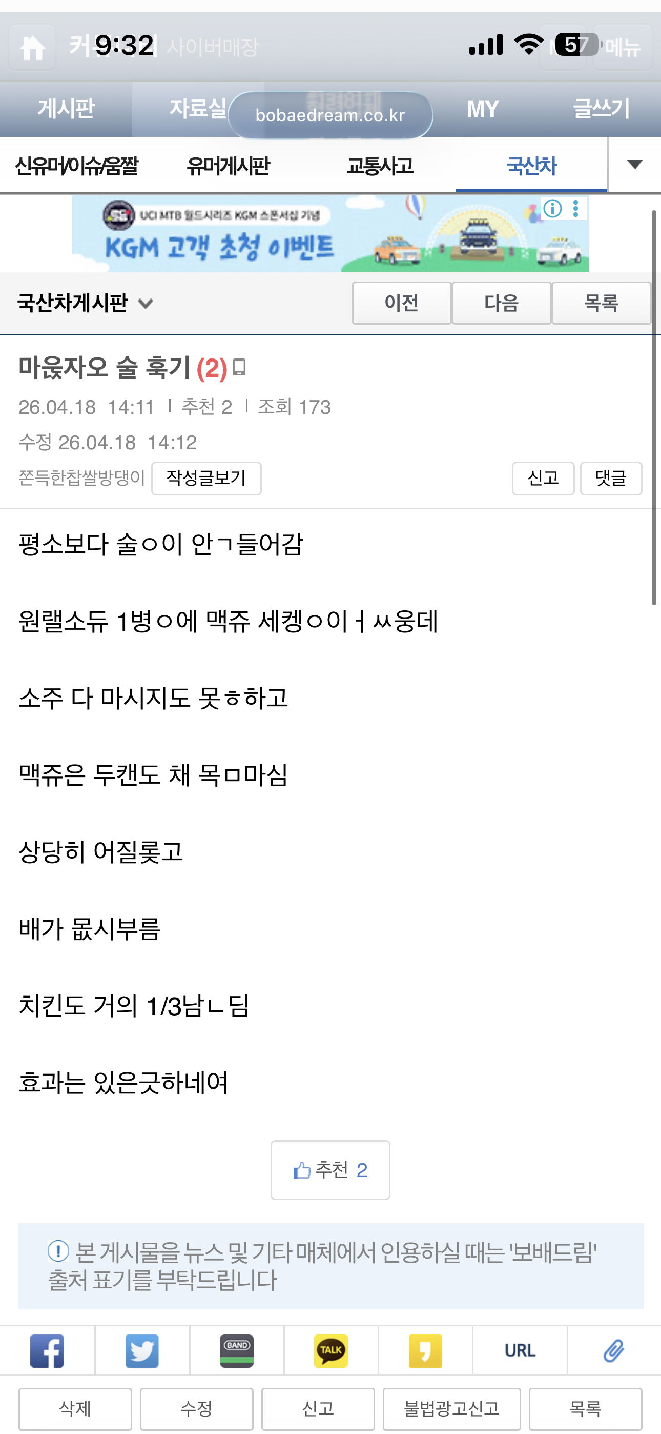 마운자로 맞으며 술 마셔본 후기 (3) 이미지 휴대전화 26.04.19 09:29 추천 0 조회 637 수정 26.04.19 09:32 쫀득한찹쌀방댕이 작성글보기 신고 댓글 기억이 안남 추천 0 본 게시물을 뉴스 및 기타 매체에서 인용하실 때는 '보배드림' 출처 표기를 부탁드립니다 페북 트윗 밴드 카톡 카스 복사 스크랩 삭제 수정 신고 불법광고신고 목록