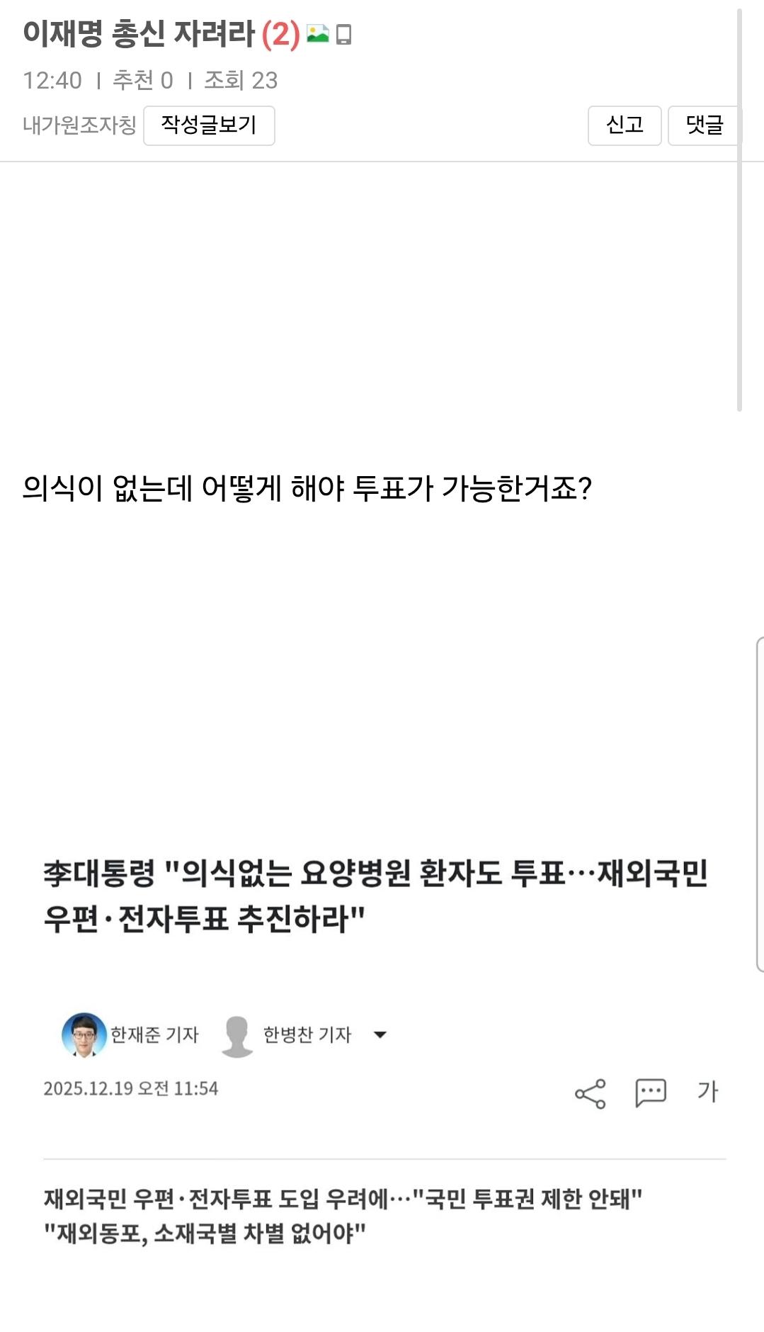 요양병원에서도 다 의식이 없는건 아니다 일부 의식 없는 사람들이 있다. 국내 요양병원에서 의식없는 사람들이 불법적으로 투표하고 있다그렇다고 그들의 투표권을 뺏을순 없다. 해외 요양 병원에서도 제도적으로 시스템적으로 보안 개선해서 요양병원에 있는 모든 사람들이 투표할수 있게해라가 이재명 발언의 취지 임요 킄ㅋ
