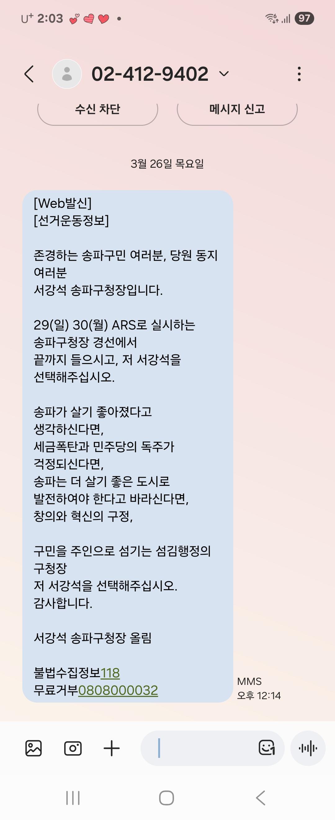 구민에게 구청장이 이런 문자 날려도 되나요? (2) 이미지 휴대전화 26.03.26 14:06 추천 0 조회 161 수정 26.03.26 14:50 팩트리어트AMG 작성글보기 신고 댓글 구청장이 구청 번호와 이름으로 '당원 동지 여러분' 이러면서 문자 보내도 됩니까? 식후 소화가 매우 거북하네요. 추천 0 반대0 본 게시물을 뉴스 및 기타 매체에서 인용하실 때는 '보배드림' 출처 표기를 부탁드립니다 페북 트윗 밴드 카톡 카스 복사 스크랩 삭제 수정 신고 불법광고신고 목록