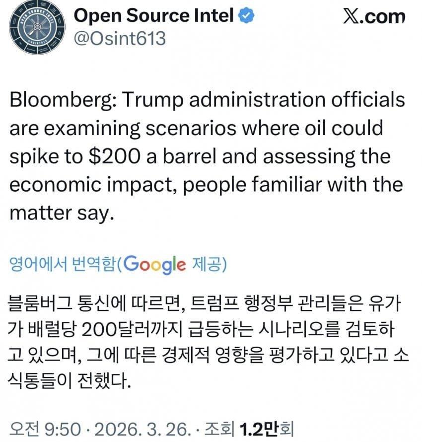 블룸버그 : 백악관은 유가 200달러 시나리오 검토 중 (34) 이미지 26.03.26 11:00 추천 498 조회 27972 일차로는추월차로임 작성글보기 신고 댓글 트럼프 한놈 때문에 온 지구촌이 몸살을 앓네요. 트럼프가 전쟁 일으키지 않았으면 코스피 7천은 그냥 가는 거였는데.... 추천 498 반대1 본 게시물을 뉴스 및 기타 매체에서 인용하실 때는 '보배드림' 출처 표기를 부탁드립니다 페북 트윗 밴드 카톡 카스 복사 스크랩 삭제 수정 신고 불법광고신고 목록