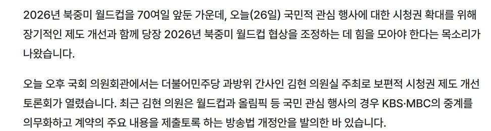 국민관심행사인 월드컵, 올림픽을 지상파에서 의무적으로 중계해줘야 된다는 법안을 발의