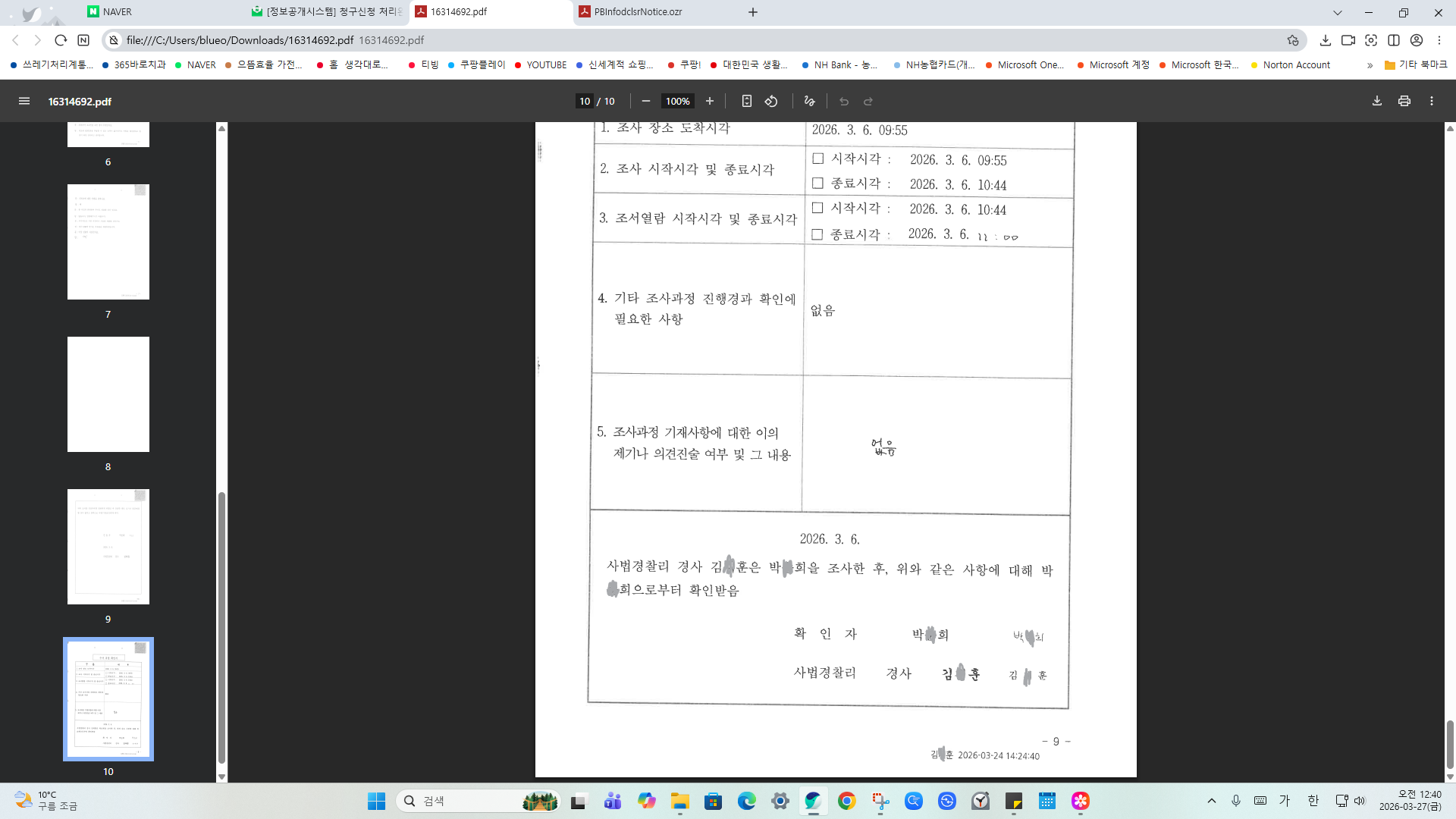 조사 20일 만에 확인한 제 조서입니다. 중간에 8페이지가 아무 내용 없이 텅 비어 있습니다. 국민의 진술을 담는 공문서가 이렇게 관리되는 게 정상입니까? 무엇을 은폐하려 했습니까?
