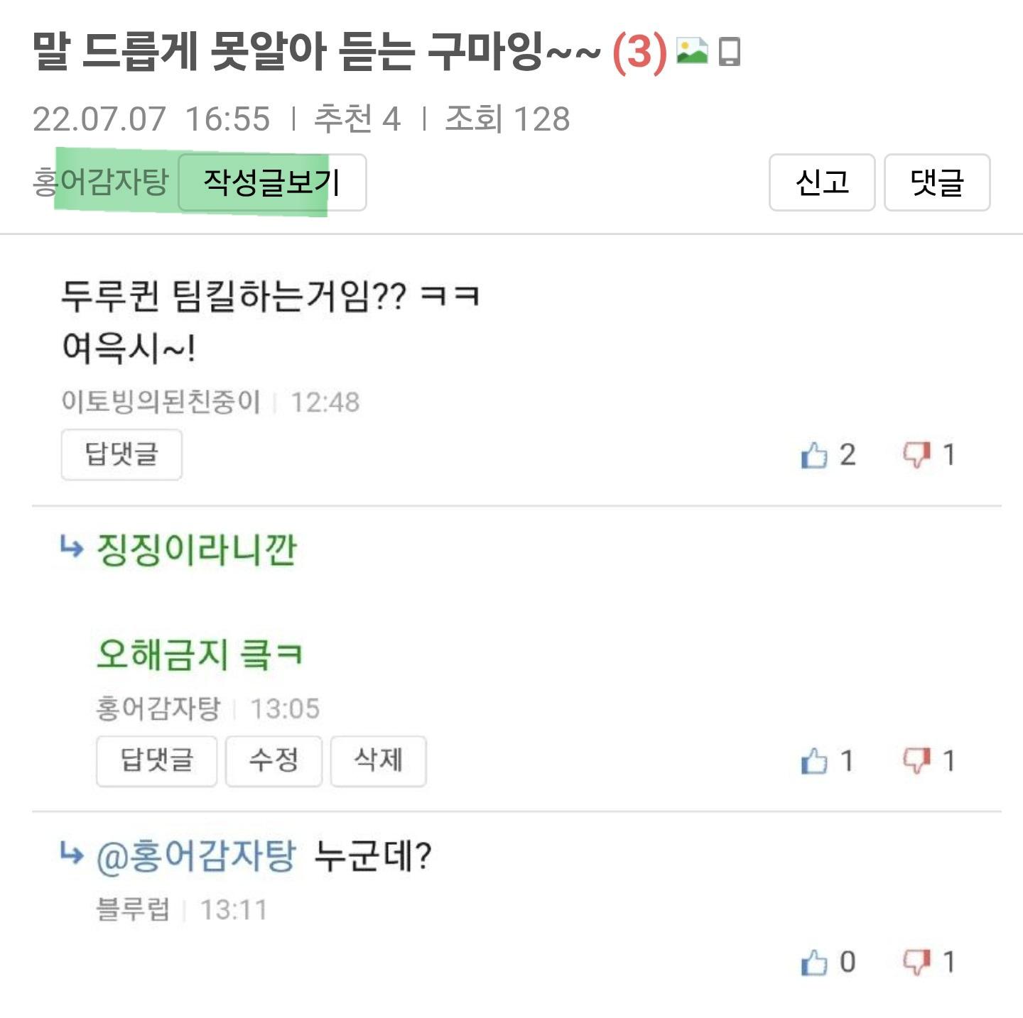 홍어매직 (3) 이미지 휴대전화 26.03.28 19:43 추천 19 조회 2394 수정 26.03.28 20:00 로제감자탕 작성글보기 신고 댓글 사투리를 원어민급 구사하시고 친히 홍어까지 닉에 박아버리셨던 홍어감자탕 님의 작성글보기를 누르면 홍어 얘기에 본인 아닌척 신분세탁중인 내가원조자칭이 등장 이것이 홍어매직. 추천 19 반대1 본 게시물을 뉴스 및 기타 매체에서 인용하실 때는 '보배드림' 출처 표기를 부탁드립니다 페북 트윗 밴드 카톡 카스 복사 스크랩 삭제 수정 신고 불법광고신고 목록
