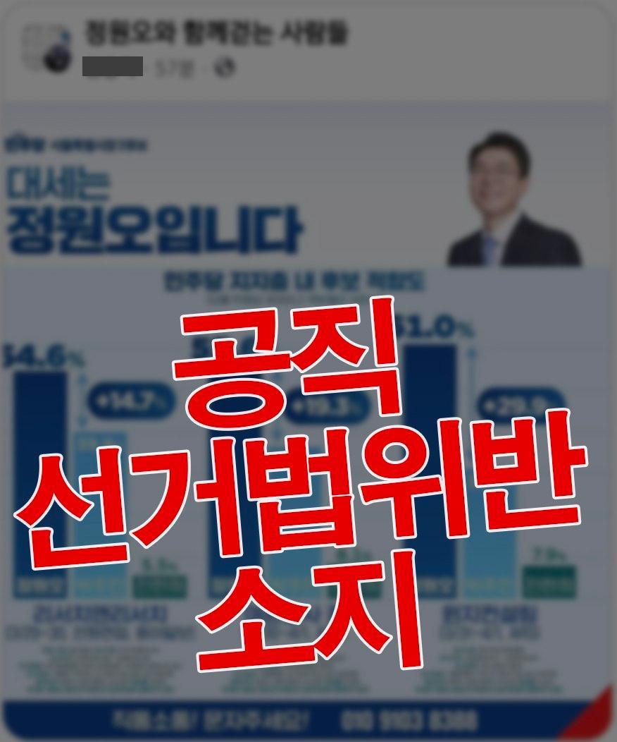 오늘 커뮤니티에 정원오 시장 지지율 관련 웹자보가 돌던데, 공식 자료도 아니라니 정말 문제네요. 유권자 입장에서는 충분히 오해할 수 있는 내용이고, 선거일 앞두고 이런 식으로 퍼지는 건 더더욱 심각하죠. 선거법 위반 소지도 있어 보이는데, 어디까지 가려는 건지 참 답답합니다. 정정 당당히 경선에 임해줬으면 좋겠습니다.