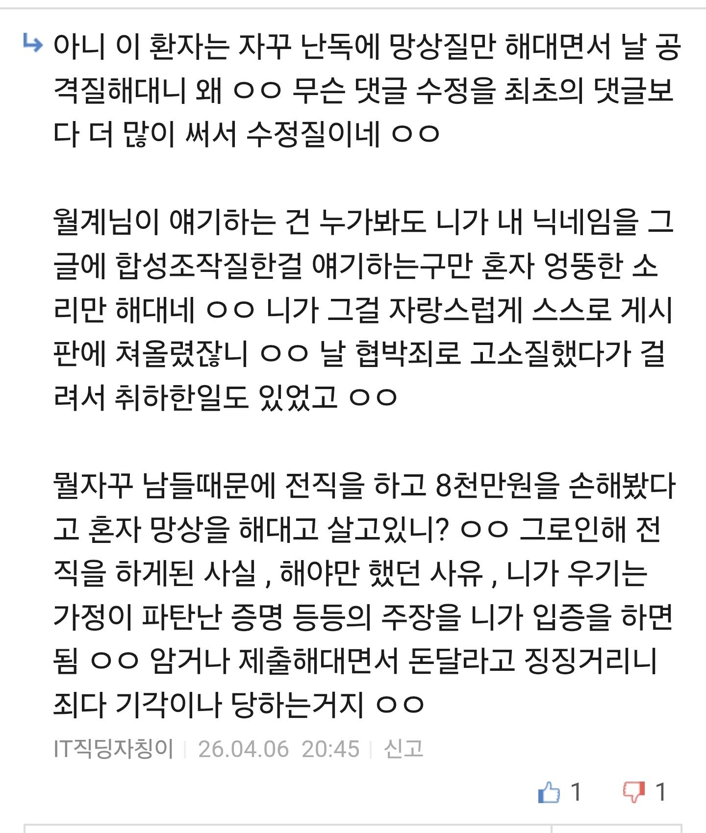 니가 계속 문신이 편들어서 오지랖 부리는거 다 이유가 있겄지. 어쨌든 난 이런 자료 전부 포함해서 소송걸때 제출하면 되니까ㅇㅇ 하는 꼬라지를 봐. 한쪽이 마치 자기 일처럼 부당한 일에도 서로 댓글 달아주고... 공생 협력관계 응? 누가봐도 니둘이 내 스토킹 공범이란 증거잖아 안그래?ㅋㅋㅋ