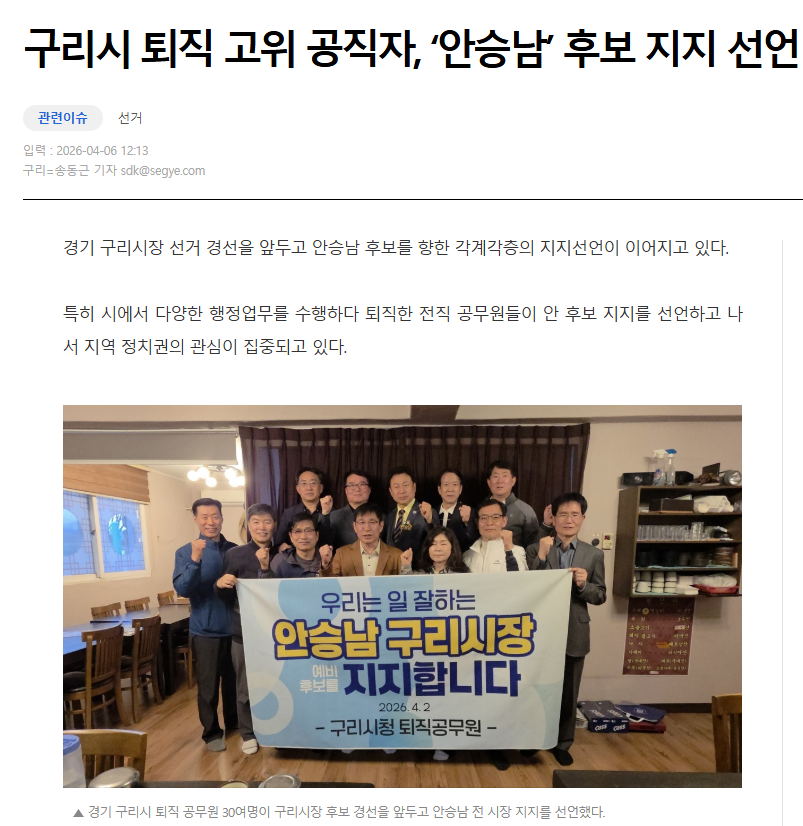 안승남 전 시장 지지선언이 각계 각층에서 진행되고 있다며 올라온 이 기사