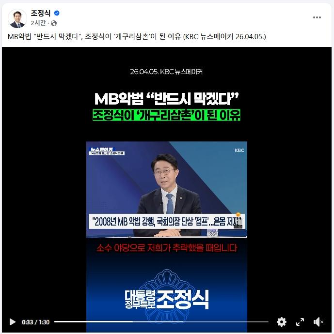 조정식 대통령 정무특보의 역할(25) - MB악법 "반드시 막겠다" 이미지 26.04.07 18:03 추천 1 조회 76 승표삼촌 작성글보기 신고 댓글 MB악법 막기 위해국회의장 단상 "점프" 해서별명이 "개구리삼촌" 추천 1 반대1 본 게시물을 뉴스 및 기타 매체에서 인용하실 때는 '보배드림' 출처 표기를 부탁드립니다 페북 트윗 밴드 카톡 카스 복사 스크랩 삭제 수정 신고 불법광고신고 목록