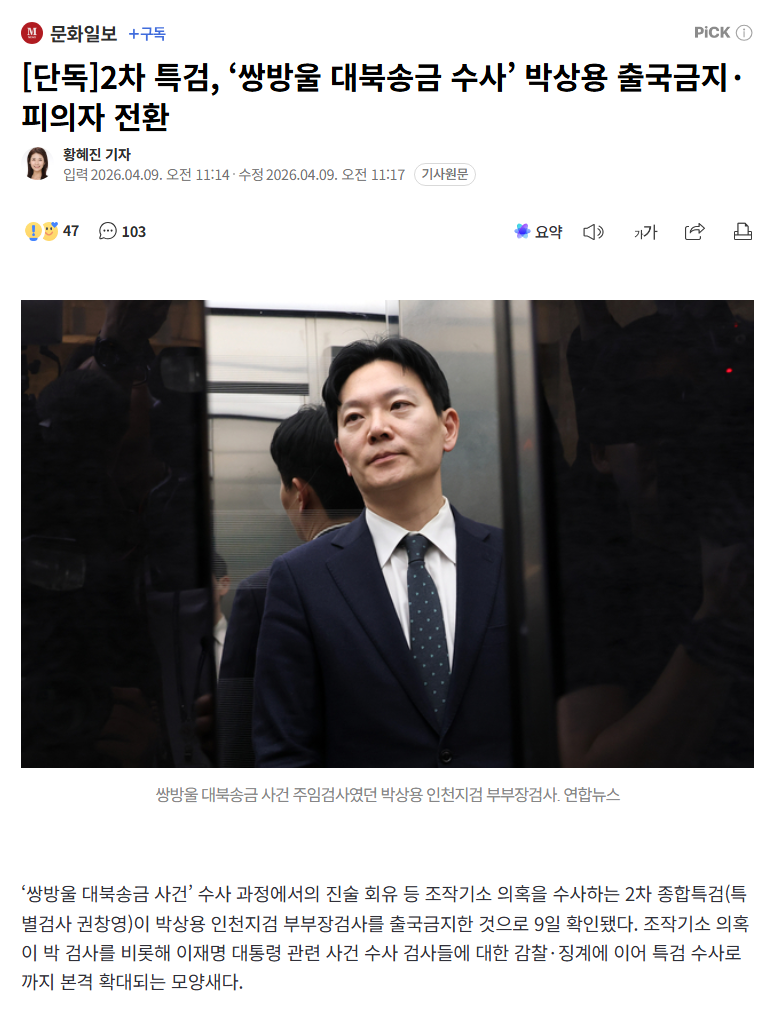 [단독]2차 특검, ‘쌍방울 대북송금 수사’ 박상용 출국금지·피의자 전환 (1) 이미지 26.04.09 11:46 추천 9 조회 134 아이피추적중 작성글보기 신고 댓글 한동훈 후달리겠네 ㅋㅋㅋ 추천 9 반대1 본 게시물을 뉴스 및 기타 매체에서 인용하실 때는 '보배드림' 출처 표기를 부탁드립니다 페북 트윗 밴드 카톡 카스 복사 스크랩 삭제 수정 신고 불법광고신고 목록