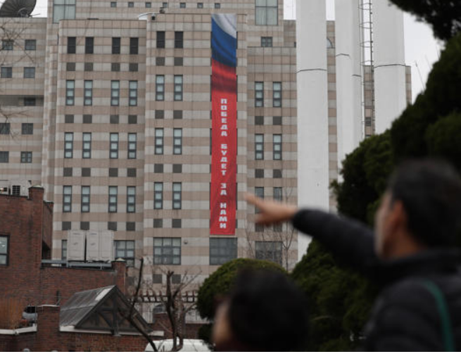 서울 중구 주한 러시아대사관 건물 외벽에 러시아어로 '승리는 우리의 것이다'라고 적힌 현수막이 걸려있다