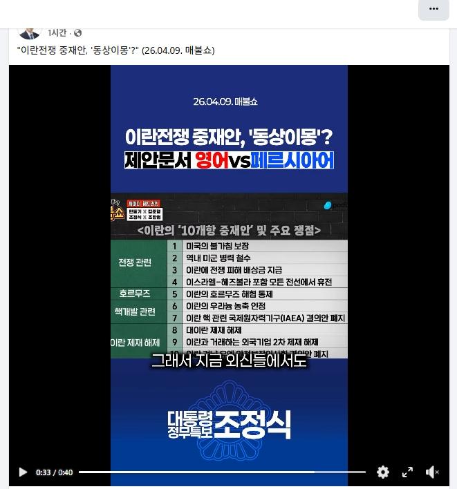 조정식 대통령 정무특보의 역할(31) - 이란 전쟁 중재안 이미지 26.04.13 16:13 추천 0 조회 108 승표삼촌 작성글보기 신고 댓글 조정식 대통령 정무특보, 매불쇼 출연!- 이란 전쟁 중재안 관련 설명 추천 0 반대1 본 게시물을 뉴스 및 기타 매체에서 인용하실 때는 '보배드림' 출처 표기를 부탁드립니다 페북 트윗 밴드 카톡 카스 복사 스크랩 삭제 수정 신고 불법광고신고 목록