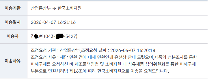 이송 사유에 나는 받지도 않은 전화 안내를 받았다는 내용이 포함 되어 있음.