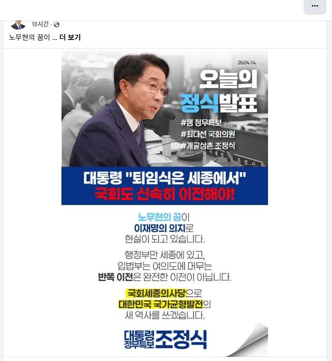 조정식 대통령 정무특보의 역할(33) - 이재명 대통령 "퇴임식은 세종에서" 이미지 26.04.15 11:40 추천 1 조회 59 승표삼촌 작성글보기 신고 댓글 조정식 대통령 정무특보- 이재명 대통령 "퇴임식은 세종에서", 국회도 신속히 이전해야! 추천 1 반대1 본 게시물을 뉴스 및 기타 매체에서 인용하실 때는 '보배드림' 출처 표기를 부탁드립니다 페북 트윗 밴드 카톡 카스 복사 스크랩 삭제 수정 신고 불법광고신고 목록