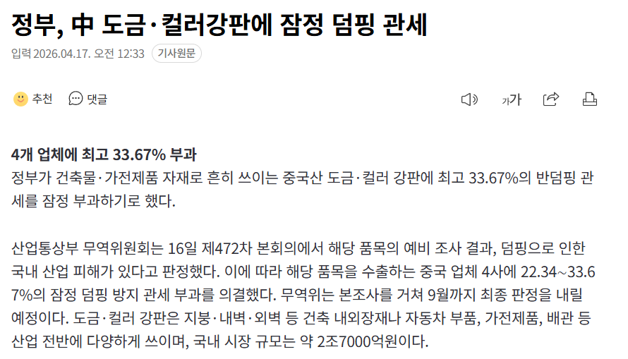 정부, 中 도금·컬러강판에 잠정 덤핑 관세 이미지 26.04.17 12:23 추천 1 조회 165 딸라달라 작성글보기 신고 댓글 https://n.news.naver.com/mnews/article/023/0003971335중국놈들 보조금 받아서 덤핑치는거 진짜 극혐임. 추천 1 반대0 본 게시물을 뉴스 및 기타 매체에서 인용하실 때는 '보배드림' 출처 표기를 부탁드립니다 페북 트윗 밴드 카톡 카스 복사 스크랩 삭제 수정 신고 불법광고신고 목록