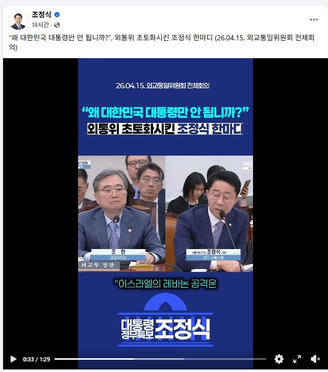 조정식 대통령 정무특보의 역할(35) - 외통위를 초토화시킨 조정식의 한마디 이미지 26.04.17 15:25 추천 0 조회 83 수정 26.04.17 15:34 승표삼촌 작성글보기 신고 댓글 외통위를 초토화시킨 조정식의 한마디 - 왜 대한민국 대통령만 안 됩니까? 추천 0 반대1 본 게시물을 뉴스 및 기타 매체에서 인용하실 때는 '보배드림' 출처 표기를 부탁드립니다 페북 트윗 밴드 카톡 카스 복사 스크랩 삭제 수정 신고 불법광고신고 목록