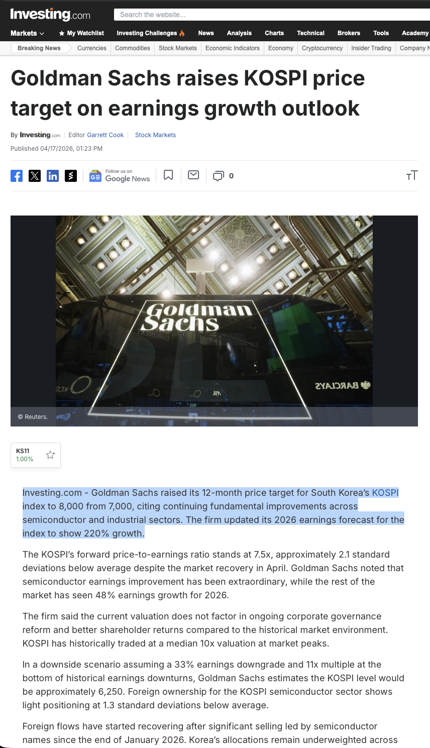 골드만삭스는 반도체 및 산업 부문에서 지속적인 근본적인 개선을 이유로 한국 KOSPI 지수에 대한 12개월 목표 주가를 7,000개에서 8,000으로 상향 조정했습니다. 그 회사는 지수에 대한 2026년 실적 전망을 220% 성장하도록 업데이트했습니다.
