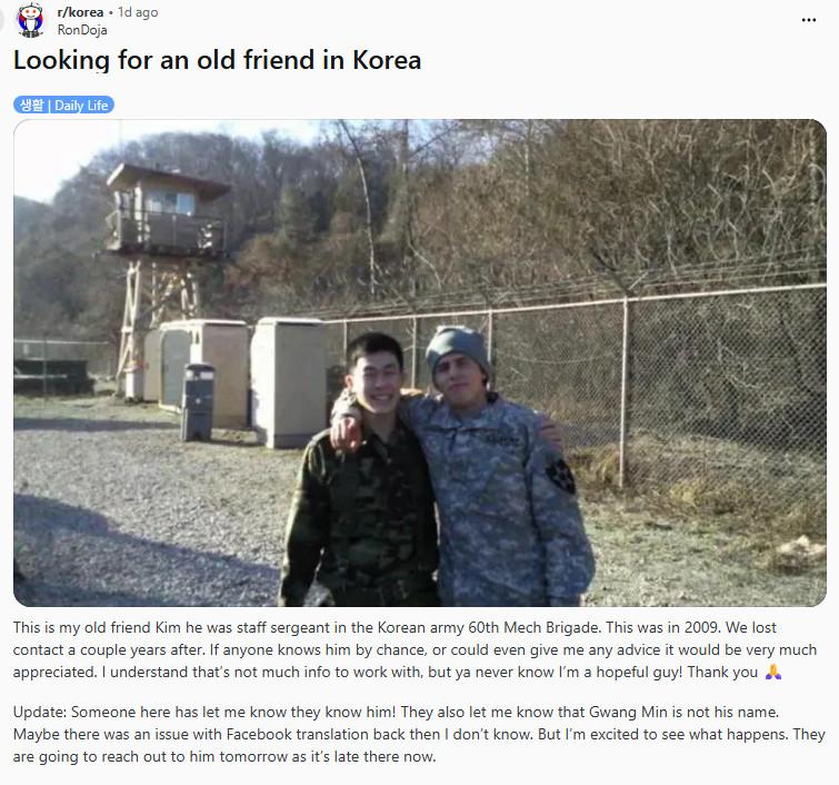 같이 복무한 한국 친구를 찾는 미군 (1) 이미지 26.04.20 14:33 추천 6 조회 903 라온미리 작성글보기 신고 댓글 Ron Doja 라는 한국에서 근무한 미군이 2009년 육군 제60기계화여단에 하사로 근무했던 김씨 성을 가진 분을 찾는다고 하네요. 추천 6 본 게시물을 뉴스 및 기타 매체에서 인용하실 때는 '보배드림' 출처 표기를 부탁드립니다 페북 트윗 밴드 카톡 카스 복사 스크랩 삭제 수정 신고 불법광고신고 목록