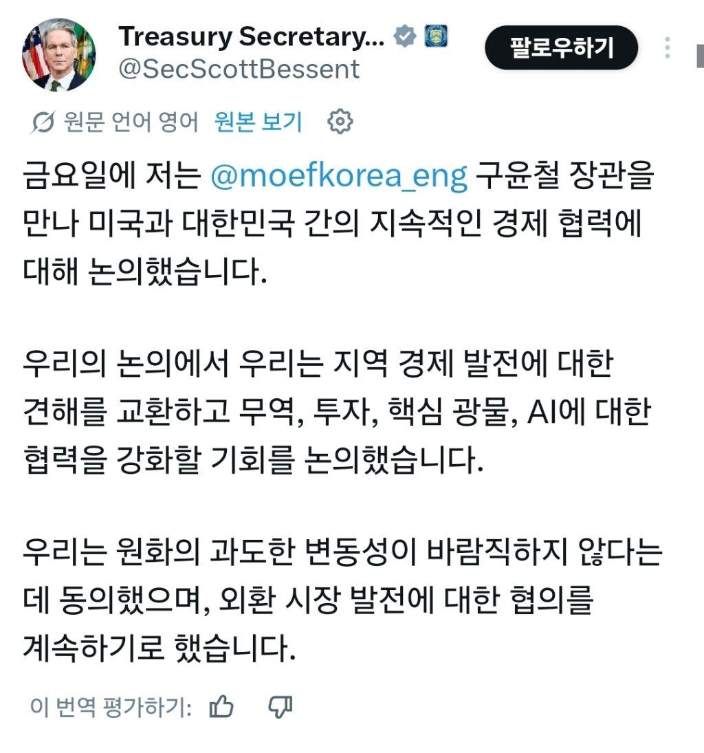 미 재무장관 SNS (4) 이미지 26.04.20 14:42 추천 22 조회 2646 희수의3초컷 작성글보기 신고 댓글 ???:장동혁이가 미 재무장관 만났어야 했는데 ㅋㅋ 추천 22 본 게시물을 뉴스 및 기타 매체에서 인용하실 때는 '보배드림' 출처 표기를 부탁드립니다 페북 트윗 밴드 카톡 카스 복사 스크랩 삭제 수정 신고 불법광고신고 목록