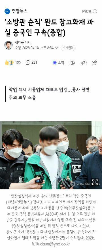 지난주에 구속됐었던 완도 창고 화재 실화 범인 (1) 이미지 26.04.20 15:29 추천 1 조회 581 gjao 작성글보기 신고 댓글 https://n.news.naver.com/article/001/0016021609?sid=102 추천 1 본 게시물을 뉴스 및 기타 매체에서 인용하실 때는 '보배드림' 출처 표기를 부탁드립니다 페북 트윗 밴드 카톡 카스 복사 스크랩 삭제 수정 신고 불법광고신고 목록