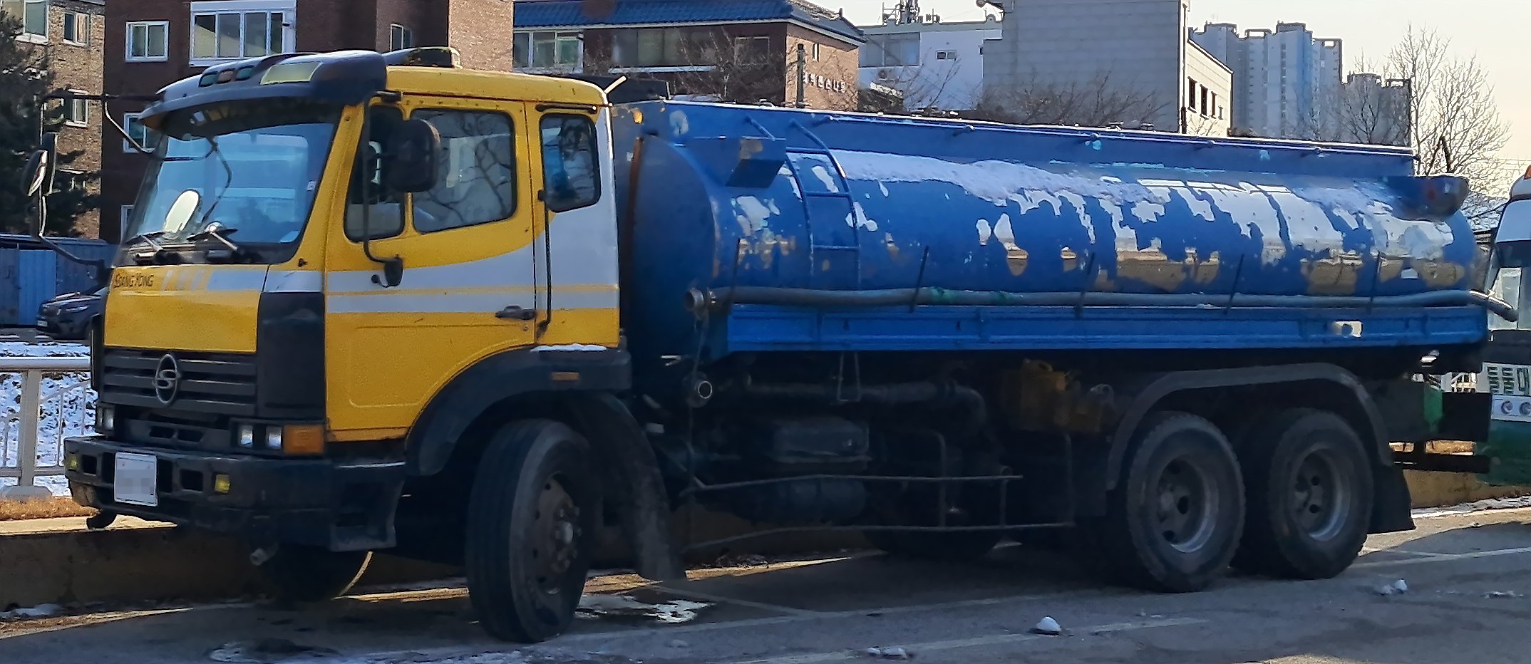 요번에는 쌍용트럭입니다. SY16톤 탱크로리 트럭입니다. 저 트럭도 이제 거의 30년이 다되가는 트럭이죠. 캡부분 도색이 덤프트럭하고 거의비슷합니다. 그러지 않아도 어디서 많이 본 도색이라는걸 알았죠.