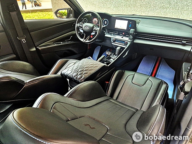 실내 공간 역시 스포티한 모습이다. 아반떼 고유의 구성을 그대로 이어가면서도 N의 감성이 더해지며 ‘감각
